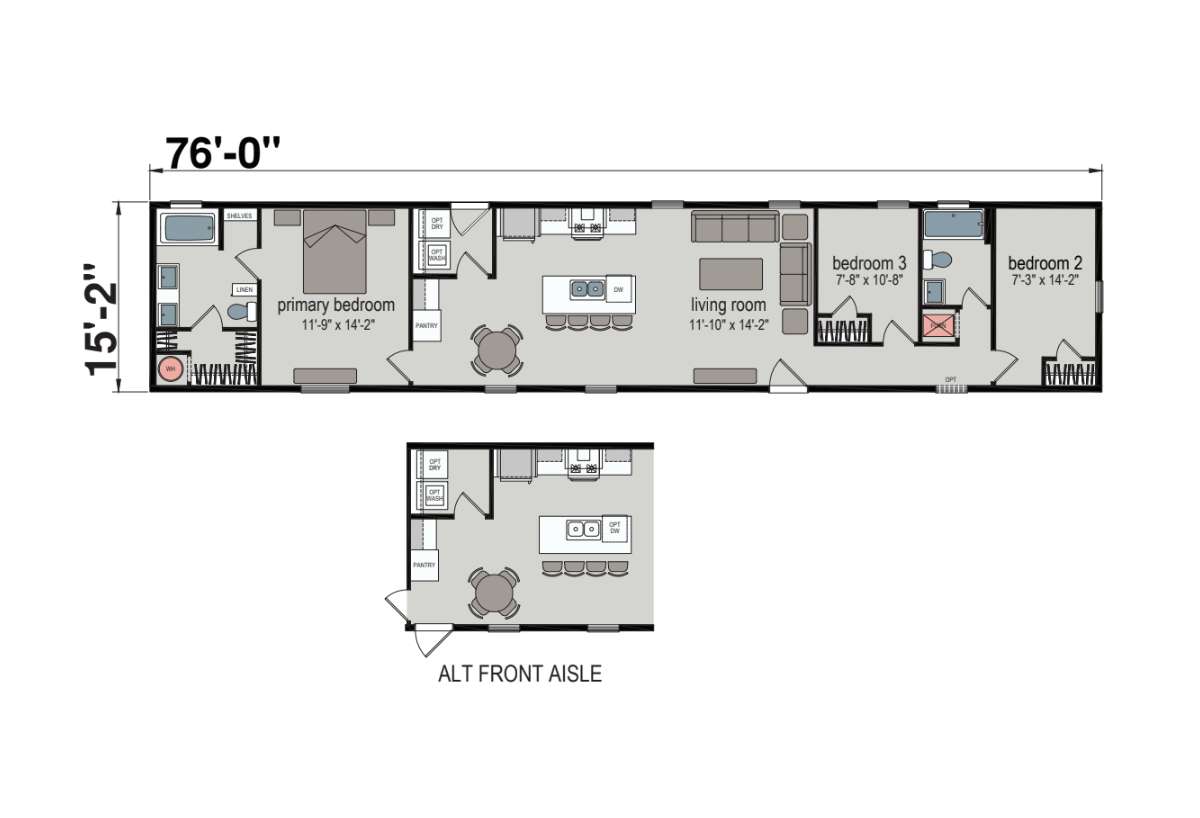 Special OrderThe Embrace 1676H32A7H 'Simplicity 2' is a well-balanced home offering 3 bedrooms and 2 bathrooms across approximately 1,153 square feet, with a 15′2″ × 76′ footprint. It features an open-concept living, dining, and kitchen area with ample storage and stylish finishes. The master suite is placed at one end for privacy, while two secondary bedrooms and a guest bath sit at the opposite side, giving both separation and flow. Smart details like a modern kitchen layout, accent walls, and efficient use of every square foot help make this plan both functional and inviting.