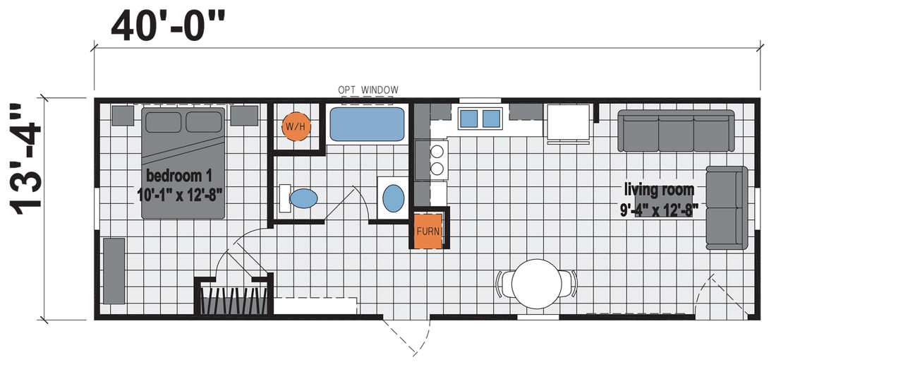 The Prairie Dune 8312 'Hank' by Skyline Homes is a compact, efficiently designed single-section home offering about 533 sq. ft. with 1 bedroom and 1 bathroom. Its footprint is 14′ × 40′, making it ideal for situations where space is limited. Though modest in size, it includes a cathedral ceiling, an open living area, a modern kitchen with stainless steel double bowl sink, full appliance provisions, and a large full bathroom. Built under the HUD code, the 8312 features standard construction including 2×4 stud walls, vinyl lap siding, Low-E single-hung windows, R-11 insulation in walls and floors, and R-19 insulation in the ceiling.