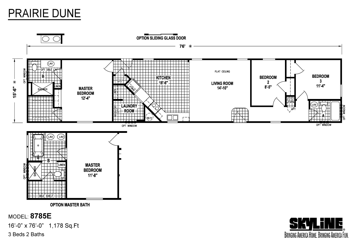 The Prairie Dune 8785E is a thoughtfully designed single‑section manufactured home offering approximately 1,178 square feet of efficient ranch‑style living featuring three bedrooms and two bathrooms. Its layout maximizes space by eliminating wasted hallways, with a roomy master suite and en‑suite bath positioned at one end of the home, opposite two king‑sized guest bedrooms and a second full bath. At the heart of the home lies a spacious living room that flows into a modern kitchen and adjacent laundry/utility room—ideal for family life and entertaining.