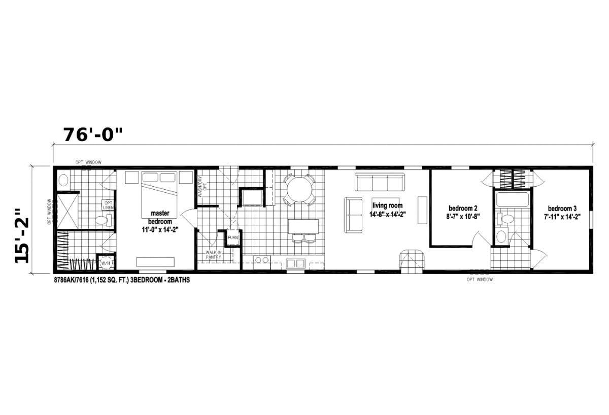 The Prairie Dune 8786AK 'Martina' is a well-proportioned single-section home offering 3 bedrooms and 2 bathrooms in approximately 1,152 square feet with a 15′2″ × 76′0″ layout. Its design features a centrally located living and dining area that flows into the kitchen and utility space, creating an open and welcoming hub for everyday living. The master suite is situated on one end for added privacy, while the two secondary bedrooms and the second bath are on the opposite side, making this layout ideal for families or shared living.