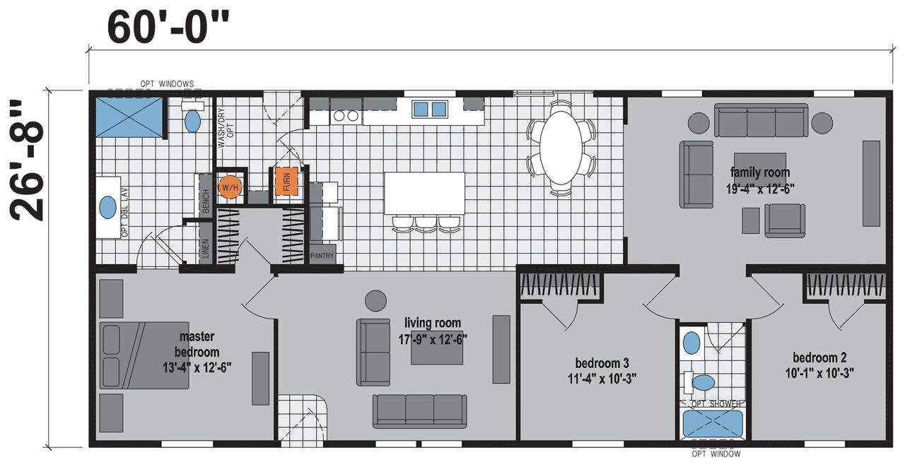 The Prairie Dune 8808J 'The Turnpike' is a spacious 1,600 sq. ft. multi-section manufactured home featuring 3 bedrooms and 2 bathrooms, designed to meet HUD code standards. Its thoughtful layout includes a welcoming family area highlighted by a cozy fireplace, an open kitchen with a central island, and the convenience of a utility room and basement stairs for added storage or expansion potential. The primary suite offers a comfortable retreat with a walk-in shower, while the open flow of the living, dining, and kitchen spaces encourages modern family living.